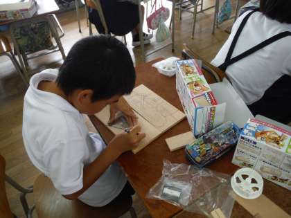 6月21日 工作 公開日 2019/06/22 更新日 2019/06/22 お知らせ 6年生がセロテープカッター(木工工作)の制作を始めていました。紙に描いたものを写したり、材料の板に直接描いたりしています。