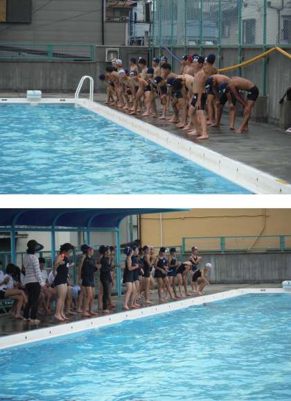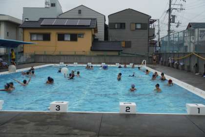 雨が上がったので、水泳学習を実施しました。水の体感温度が心配でしたが、実際に水につかった担当者によると、「運動していると大丈夫だった」そうです。