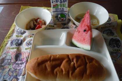 7月2日 給食 公開日 2019/07/03 更新日 2019/07/03 お知らせ 【パン・牛乳・鶏肉と夏野菜のソテー・おし麦のスープ・すいか】 蒸し暑さに疲れた体におし麦のスープの塩分が染みわたり、すいかの糖分を含んだ水分でのどを潤し、午後からのエネルギー補給です。