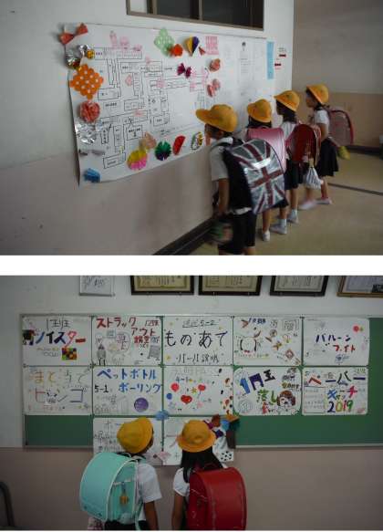 児童ホールにフェスティバルのPRポスターや、教室の配置図が掲示されています。登校した児童は、これらの資料で内容と場所を確認します。いよいよフェスティバル本番。子どもたちは、心なしかうきうきしているようでした。