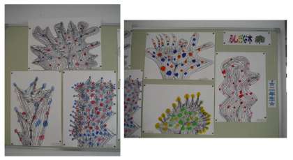 2年生の掲示物「ふしぎな木」です。水面に波紋が広がるように描いていきます。波紋の広げ方に個性が現れます。