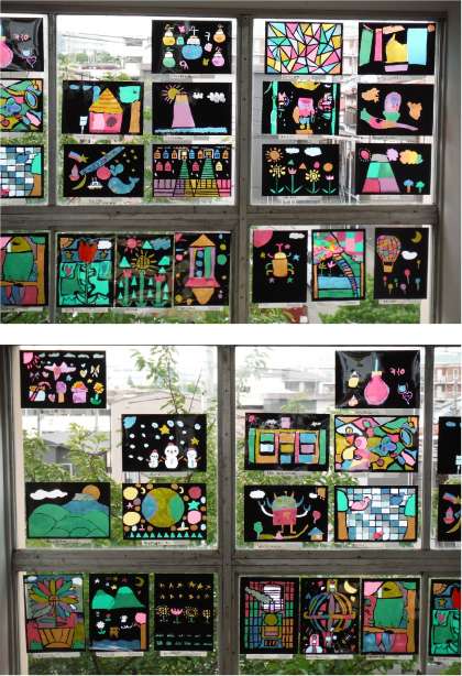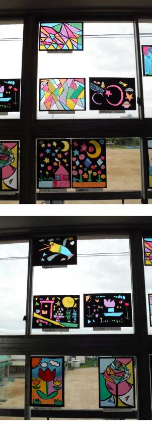 4年生の「ステンドグラス」が完成し、教室近くの窓に飾ってありました。日光を受けると、いろんな色がきれいに輝きます。