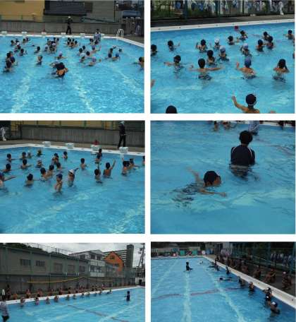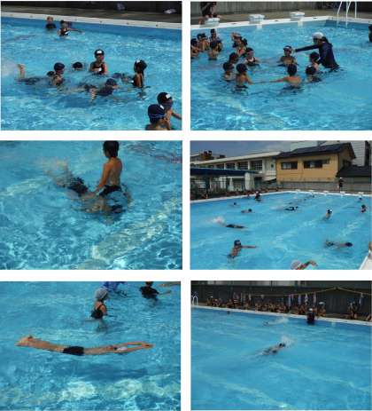 水中ダンスで右に、左に移動して、水面をバシャンと叩いて大はしゃぎ。仰向けで浮くコツが、だんだんつかめてきた児童もいます。どちらの学年でも、蹴伸びにもチャレンジしました。