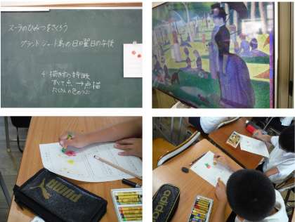 7月11日 図画工作5年生 公開日 2019/07/11 更新日 2019/07/11 お知らせ ジョルジュ・スーラの絵画技法を調べ、それをまねて絵を描きました。パスで細かい点をいくつも描くと、それが集まって一つの絵になります。子どもたちは、たいへん集中していました。