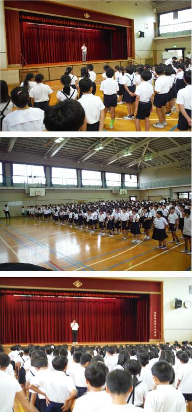 終業式です。午前8時45分開始の予定でしたが、少し早く始めることができました。はじめに、整列のための合図を出したところ、子どもたちはすぐに終業式モードに切り替わりました。