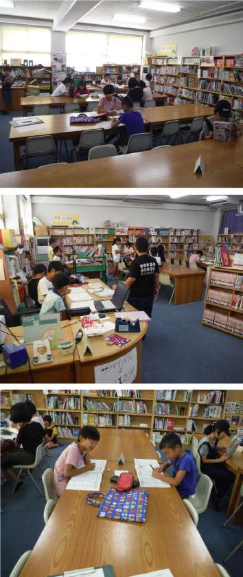 今日から4日間、午前中に図書室を開放しています。図書委員が来て、本の貸し借りの手続きをしてくれます。読書以外にも、涼しい図書室で宿題をする児童もいます。
