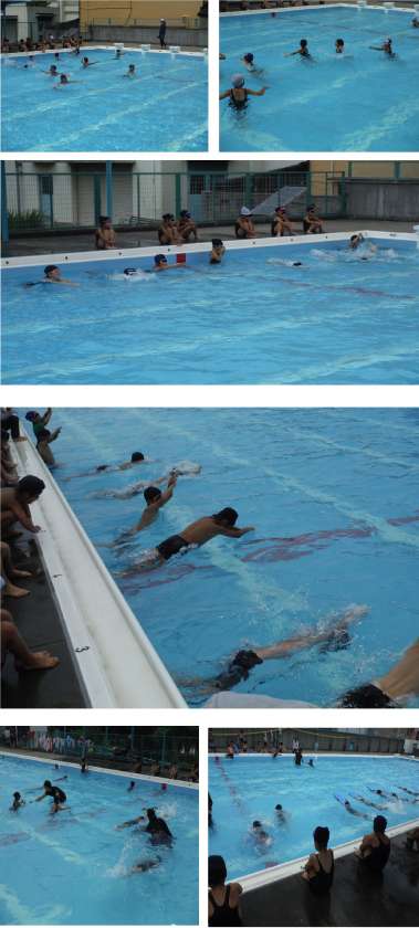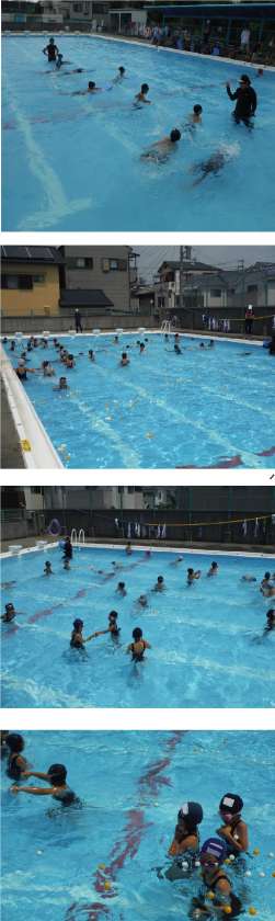低学年が楽しそうに水中かけっこや蹴伸びなどをしています。宝探しではピンポン玉も浮かんでいるので、潜るのが苦手でもたくさんの宝をとることができます。期間中、安全に注意しながらプール開放を楽しめるようにしたいです。