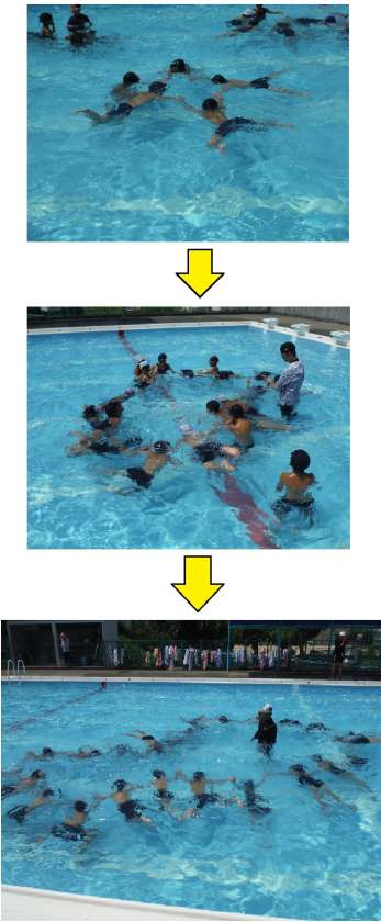 手をつないで伏し浮きをします。伏し浮きの輪は、どんどん大きくなります。大人数でも上手に浮けるようになりました。
