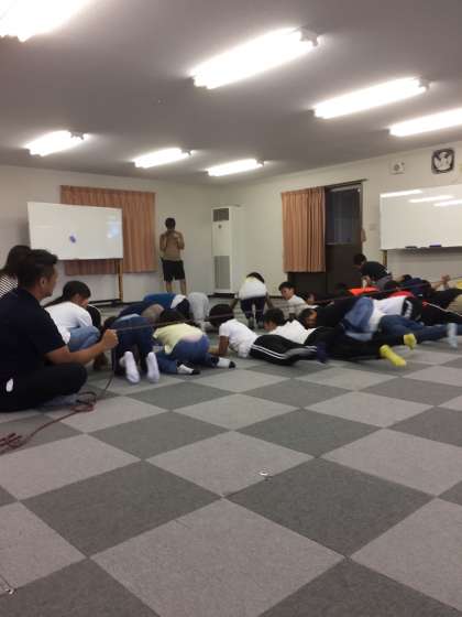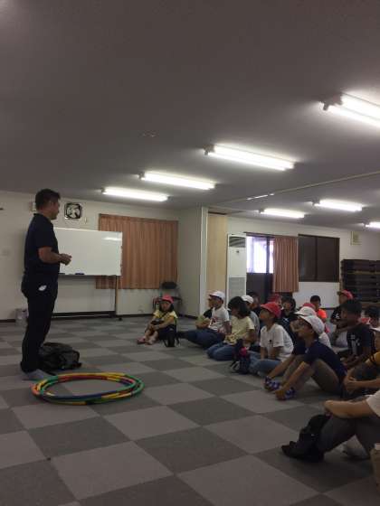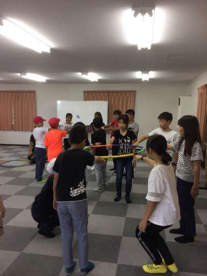 林間学習 プロジェクトアドベンチャー1 公開日 2019/07/29 更新日 2019/07/29 お知らせ クラス全員の力を合わせて、出された課題を解決するプロジェクトアドベンチャーです。 これは、一つのフープ(輪)を指先に乗せ、フープを上昇させたり下降させたりする課題です。動作の掛け声はありません。フープを通してみんなの気持ちを読み取り、上昇・下降させます。指先が離れないよう、意識を集中します。