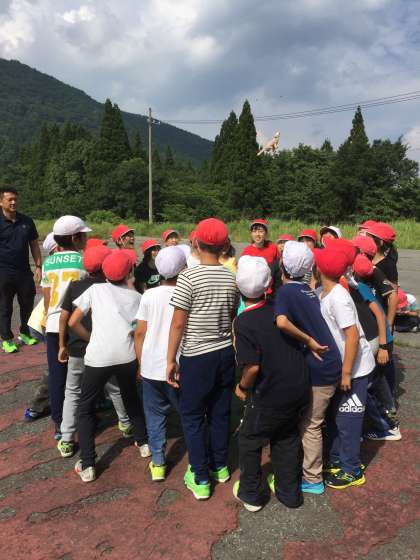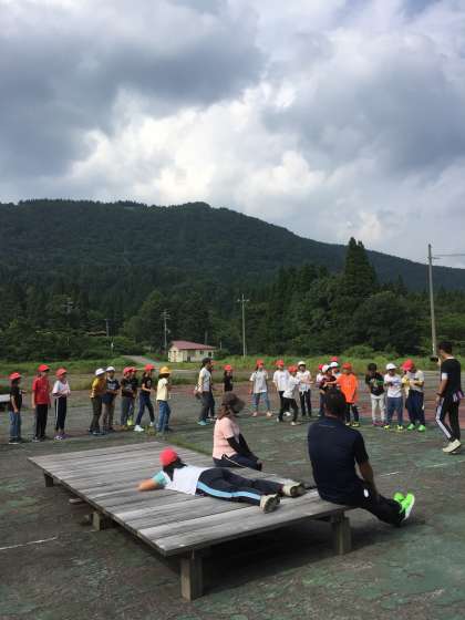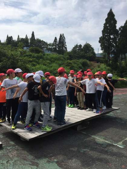 これは、大きな一枚の板にクラス全員が乗ろうとしているところです。板は不安定な土台に乗せられているため、すでに板に乗った人と、今から乗ろうとしている人でバランスをとり合いながら乗っていきます。全員が乗れると、とっても爽快です。
