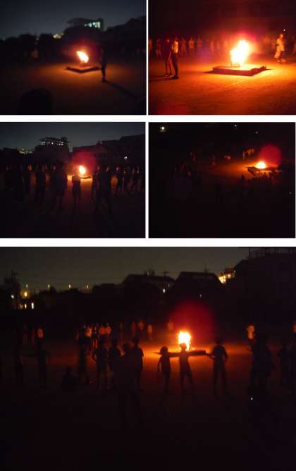 夜は、キャンプファイヤーです。本校卒業生が、キャンプリーダーとして場を盛り上げてくれました。火を囲んで楽しく過ごせました。