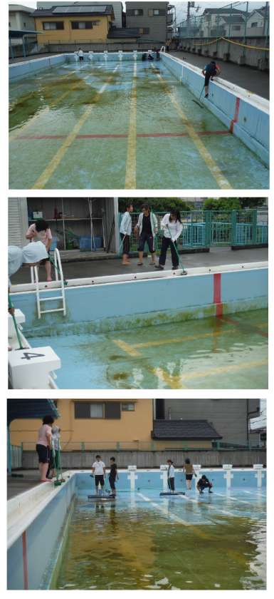 雨と雷のため、予定していた清掃が危ぶまれましたが、一時にザーッと降って、雨は上がったので、開始を少し遅らせて実施しました。しばらく使用していないと壁や床がすっかり緑色になっていました。