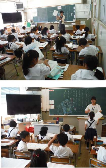 始業式が終わって教室に戻りました。毎学期はじめは提出物が多く、子どもも先生も提出・回収で大忙しです。写真は1年生の教室です。提出するものをひとつずつ確認しながら回収していました。