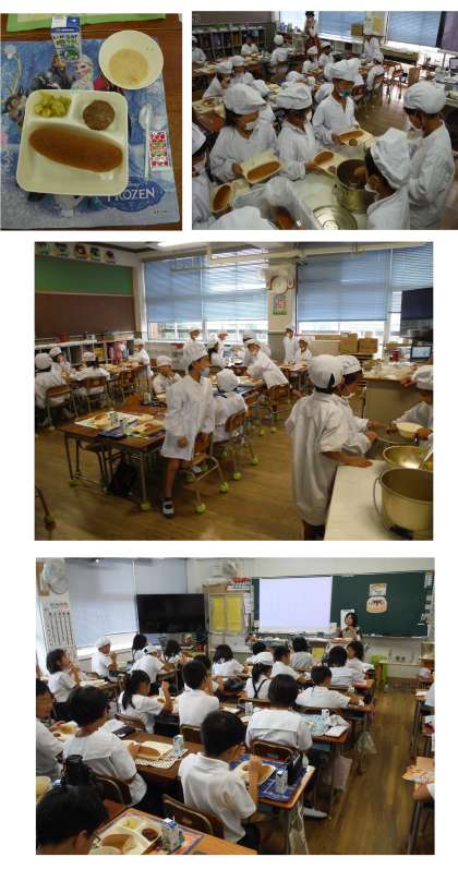 久しぶりの給食です。本日のメニューは【パン・牛乳・焼きハンバーグ・豆乳スープ・キャベツのカレーソテー】です。豆乳がおなかに優しくしみわたり、食が進みました。