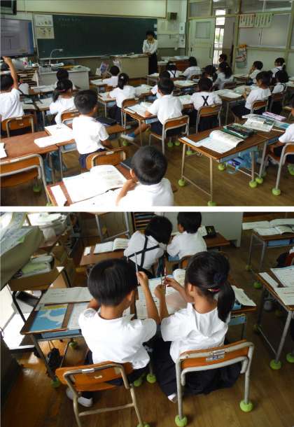 1年生「ながさくらべ」の学習です。2本の鉛筆の長さをどのように比べるかについて考えています。「『鉛筆を机に立てて比べる(⇒つまり、鉛筆の片方の端をそろえる)』と発表したAさんの考え方のよいところは何だろう。」という先生の問いかけに、隣り同士で意見を伝え合っているところです。