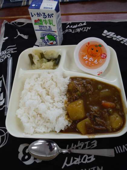 【牛乳・ビーフカレーライス・野菜のピクルス・みかんゼリー】