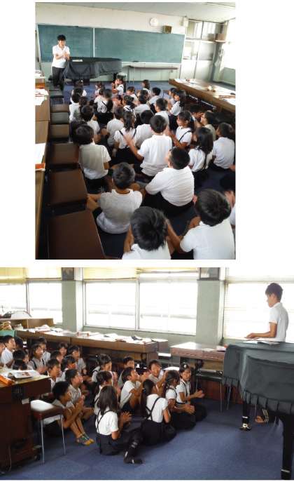 3年生がリズム打ちでウォーミングアップをしています。「森のくまさん」に合わせて手拍子を入れるのですが、既定の数より多く手をたたいてしまい、少し難しそうでした。