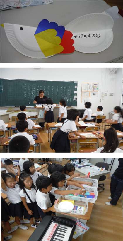 2年生は、半分にした紙皿の内側にメッセージを書き、外側に飾りをつけます。すると、紙皿が「平和の象徴」の鳥になります。