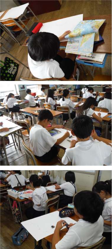 高学年では、国際平和ポスターを描いています。世界の国や地域が手を取り合って、平和な地球を作れるようにしたいですね。