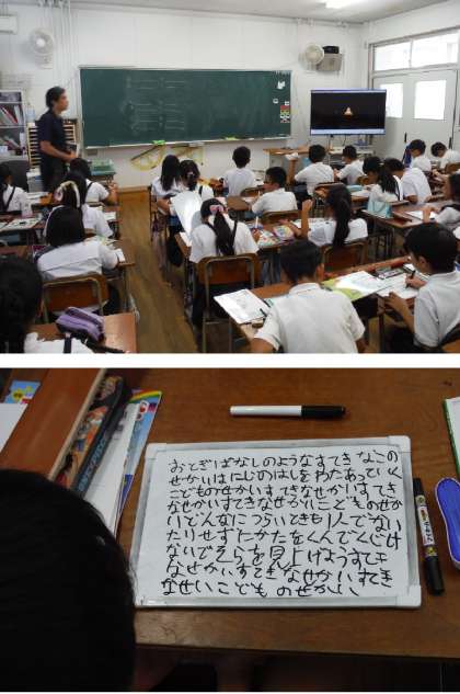 CDで歌が流れます。よく聞いて、歌詞を発表ボードに書き込みます。言葉をしっかり聞き取らないといけないので、とても集中していました。
