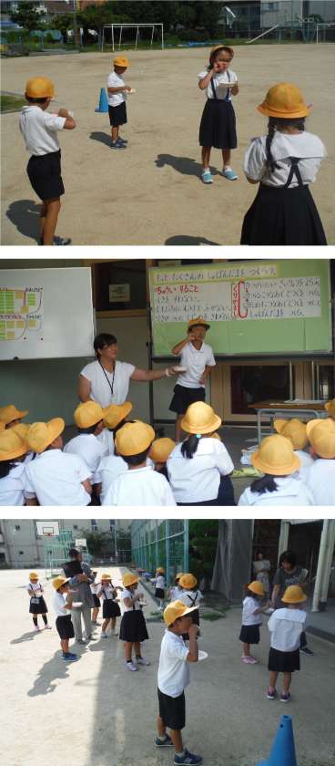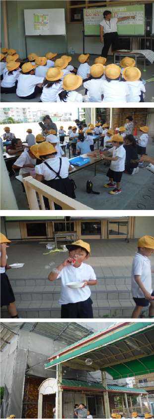 1年生の研究授業です。先日から両クラスで取り組んできた「シャボン玉遊び」で、職員が研鑽を積みます。道具に改良を加え、一度にたくさんのシャボン玉を飛ばせるようにします。自分が工夫したことをみんなに教える場面もあり、楽しそうに活動していました。
