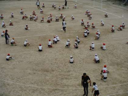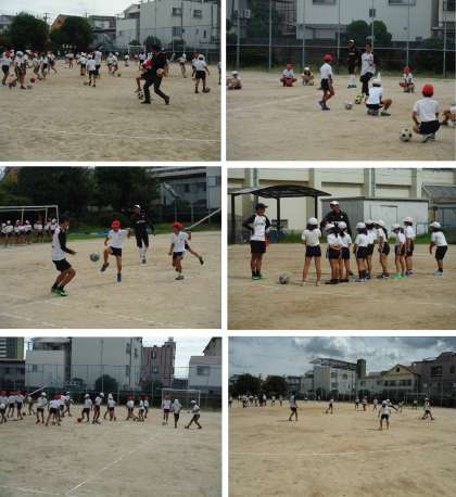 セレッソ大阪コーチ陣による夢授業がありました。ウォーミングアップの軽い運動の後、コーチ2人対児童6〜8名ぐらいの対戦を行いました。子どもたちは一生懸命ボールを追いかけますが、コーチの足さばきはさすがです。楽しくサッカーに触れることができました。