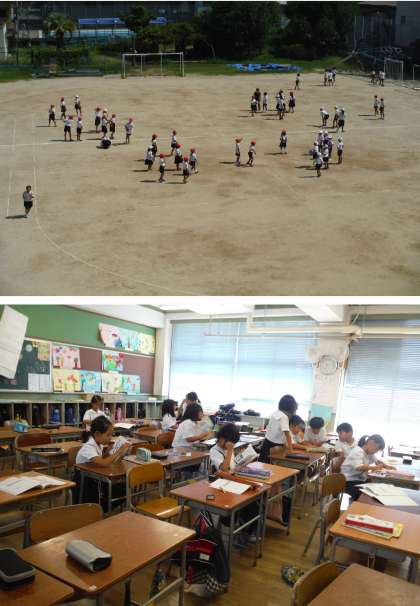 クラス遊びでしょうか、運動場でドッジボールをしています。教室で過ごす児童は、本を読んだり、絵を描いたりしています。じりじりとした暑さが続くので、水分をしっかりとって、元気に過ごしてほしいです。