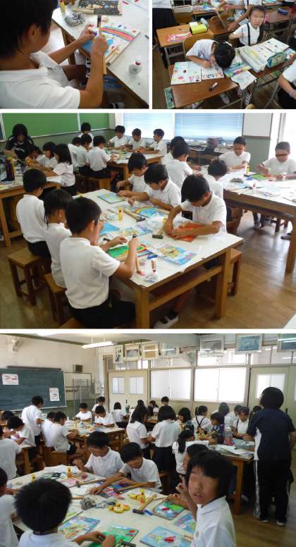 絵を描いた板にくぎを打ち付けて、コリントゲームを作っています。釘打ち補助具を使いますが、それでも釘が曲がってしまうことがあり、慎重に釘打ちをしていました。