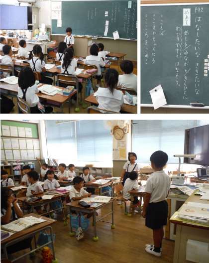 国語の学習です。話したいことをみんなの前で話すのですが、作文したものを読むのではありません。手元には、話す内容のメモだけを持ち、それをチラリチラリと見ながら話します。自分が思ったことや感じたことも話します。「〇〇のような」という例え(比喩表現)を使って話す児童もいました。話が終わると、指名を受けた聞き手の児童が質問をするようにしているので、聞く側も集中していました。