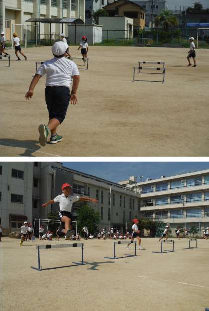 3年生の陸上運動(ハードル走)です。今日は足の振り上げと、踏み切った方の足の動きをポイントに練習していました。