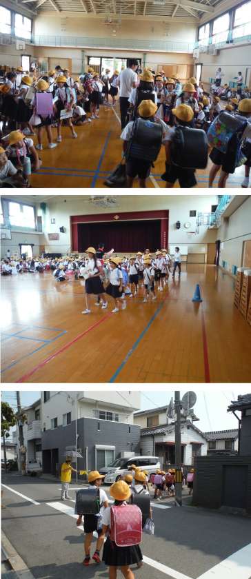 9月11日 避難訓練・集団下校2 公開日 2019/09/12 更新日 2019/09/12 お知らせ 生活指導担当と学校長の話を聞いてから下校します。地区別班ごとに順次下校するため、下校時刻に差はできましたが、子どもたちは落ち着いて行動し、混乱はありませんでした。