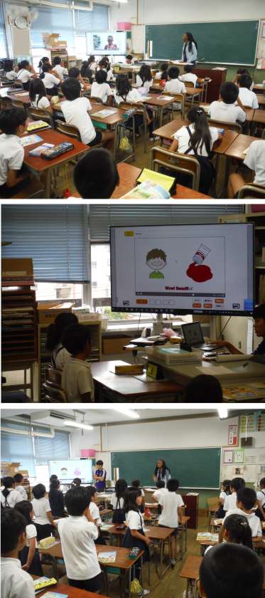 テニー先生が3年生の教室で英語学習をしてくださっています。「I like 〇〇(色)」いろいろな国の子どもが「I like 〇〇(色)」と、好きな色を言いながら虹を描いていきます。何色を使っているか、音声をよく聞いて想像します。