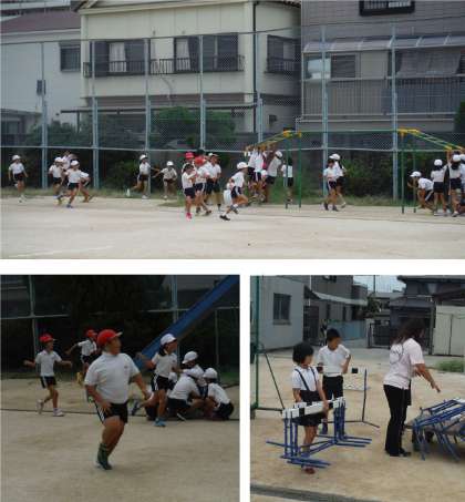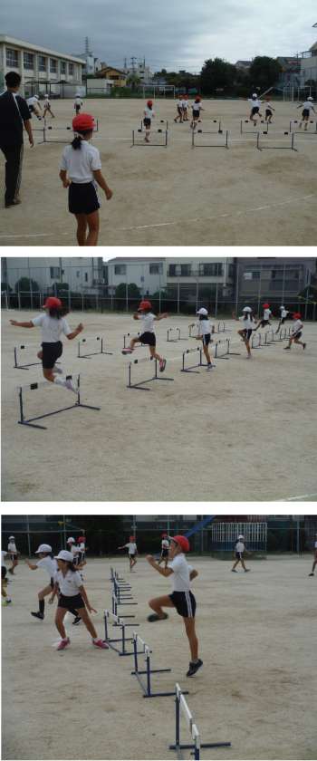 3年生の体育です。ウオーミングアップに「色おにごっこ」をしています。先生が指定した色があるところに駆けつけ、その色を触ります。鬼にタッチされる前に触らないといけません。ウオーミングアップの間、見学の児童がハードルの準備を手伝ってくれました。