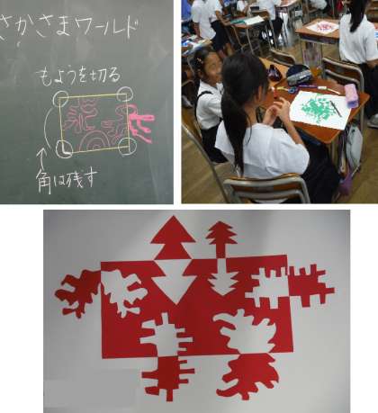 5年生が切り絵のような作品を作っていました。用紙の端から好きな形に切ります。切ったものを外側に折り返すようにして貼り付けます。線対称の部品からなる面白い作品ができました。