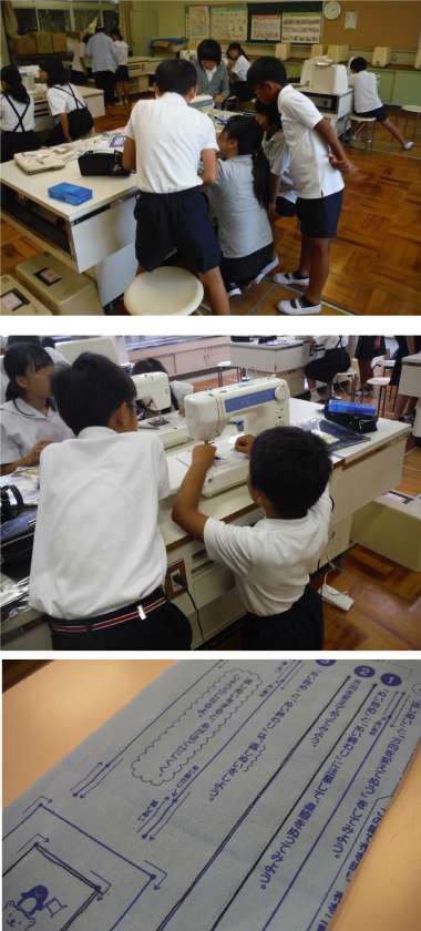 今回は1組のミシン実習の様子です。ミシンの準備ができたら、練習布を使って練習します。待ち時間には、同時進行でエプロンづくりのための布を切っておきます。