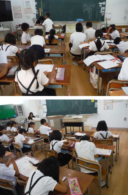 朝の様子です。先生が宿題をチェックしています。その間子どもたちは連絡帳を書いたり、漢字の練習をしたりしています。近々漢字のテストがあるようです。