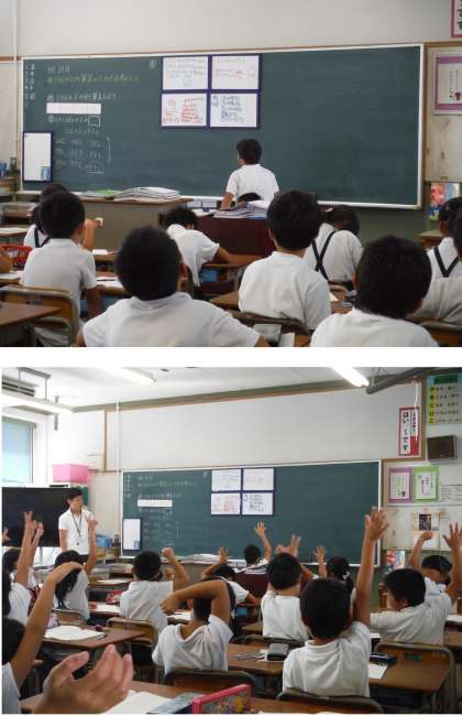 算数の授業で、自分が考えた問題の解き方を説明しています。聞いている側の児童も、自分と同じ考えかどうか、ハンドサインで示します。