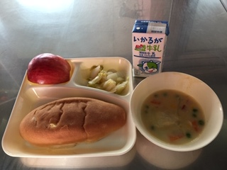 アレルギー対応食で米粉のルーを使ったコーンクリームシチューでした。小麦粉よりさらっとしています。はくさいのピクルスはあっさりとしていました。りんごはつがるという品種でした。今日もおさつパンでした。月替わりだったこともあり、同じパンが重なったようです。非常に珍しいことです。