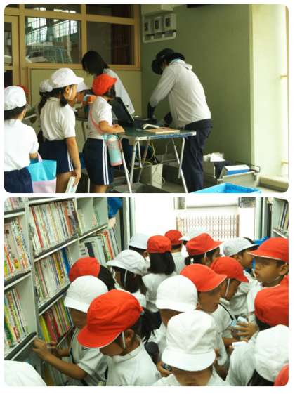 今月の自動車文庫です。写真は1年生が貸し出し、返却に来ている様子です。貸し出しカードを握りしめ、本を選んでいます。