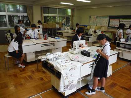 次々とエプロンが完成し、ミシン実習が大詰めを迎えています。エプロンの形ができたら、ポケットやアイロンプリントの飾りをつける児童もいました。作ったエプロンを使う日が楽しみです。