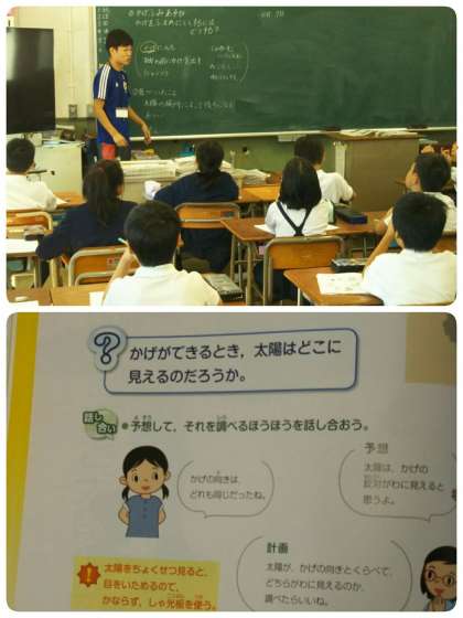 理科。影のでき方と太陽の関係の学習です。「影ふみあそび」を例に、影のでき方について気づいたことを発表していました。
