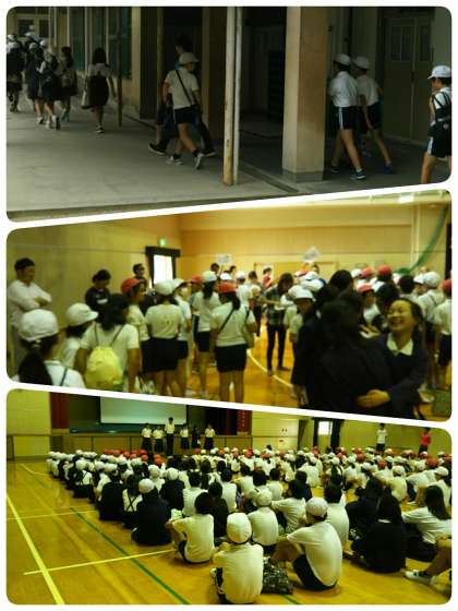 およそ半年後に始まる中学校生活に向けて、6年生が中学校の授業と部活動を体験しに出かけました。淀中学校に着いたら、まず講堂に集まりました。淀中学校下の3小学校が集まったので、習い事などを通じて既に顔見知りの友だちを見つけて、あいさつを交わす場面もありました。どんな体験活動が始まるのかな。ちょっとドキドキです。