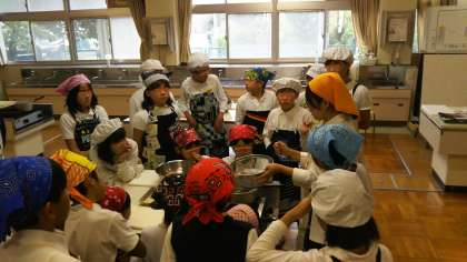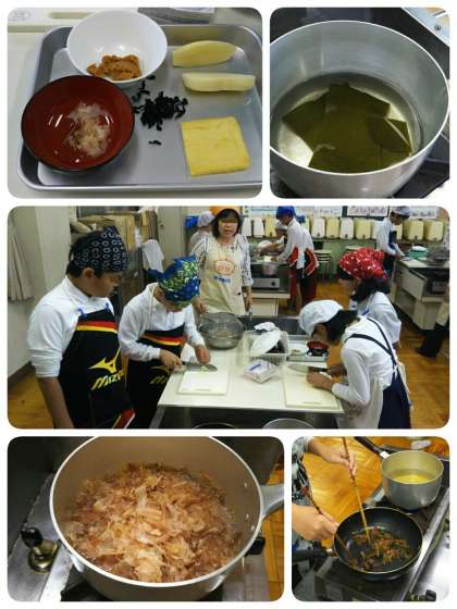 次はみそ汁を作ります。作り方を教えてもらい、やや緊張しながら作り始めました。だしをとる間に具材を切っていきます。だしを取り始めると、家庭科室がいい香りで包まれました。