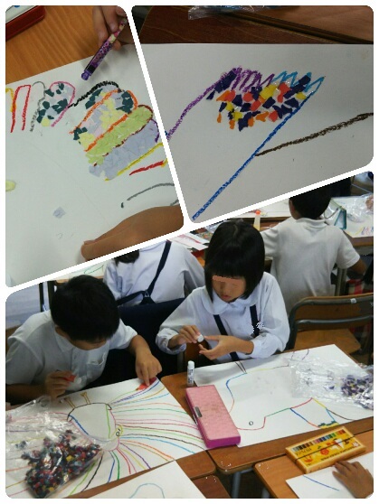 3年生、ちぎり絵の続きです。しっかりした選で描いた下描きにちぎった紙を貼っていました。細かくちぎった紙にのりをつけて、慎重に貼り付けていました。