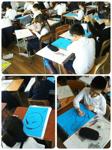 4年生の版画です。「ごんぎつね」の一場面を題材としています。版画板に下絵を写し、彫刻刀で掘る部分が分かりやすくなるよう、サインペンで下絵の線を太くしています。
