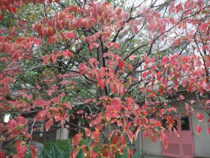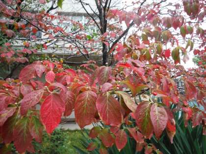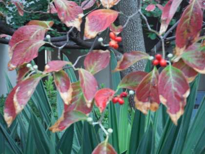 玄関のハナミズキの葉が赤く色づています。赤い実もついています。