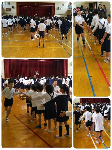 一列に並び、腰のあたりで手のひらを広げて立ちます。先頭から順に、列の後ろへ移動します。その際、後ろの人の手にタッチしていきます。前の人が移動したら、その次の人が同じようにタッチしながら列の後ろに行くことを繰り返し、全員が移動し終える速さを競いました。分かりやすいルールで、盛り上がっていました。