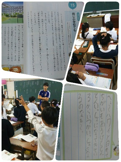 3年生の教室です。ハワイの学校と日本の学校では、違うところがあるけれど、意外なところでつながっていることを扱った教材です。違いを知り、その違いを認め合いながらつながりを持てることは素晴らしいですね。。