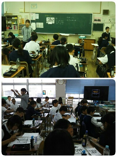 習字セットを使って何かしているので、(書写かな。)と思い、教室をのぞいてみました。毛筆を使ってはいますが習字ではなく、墨で文字や絵など、思い思いのものを描いていました。いろいろな道具で「描く」こともおもしろいですね。