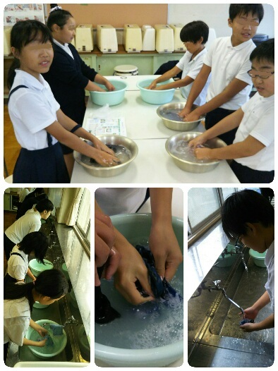 6年生家庭科の学習です。靴下やハンカチを手洗いしていました。今はスイッチ一つで済んでしまいますが、洗濯の手順を知っておくおことは停電などの非常時の備えとして大切です。また、洗濯機が発明される以前の歴史を体感する点でもよい学習です。さて、きれいに洗えたでしょうか。